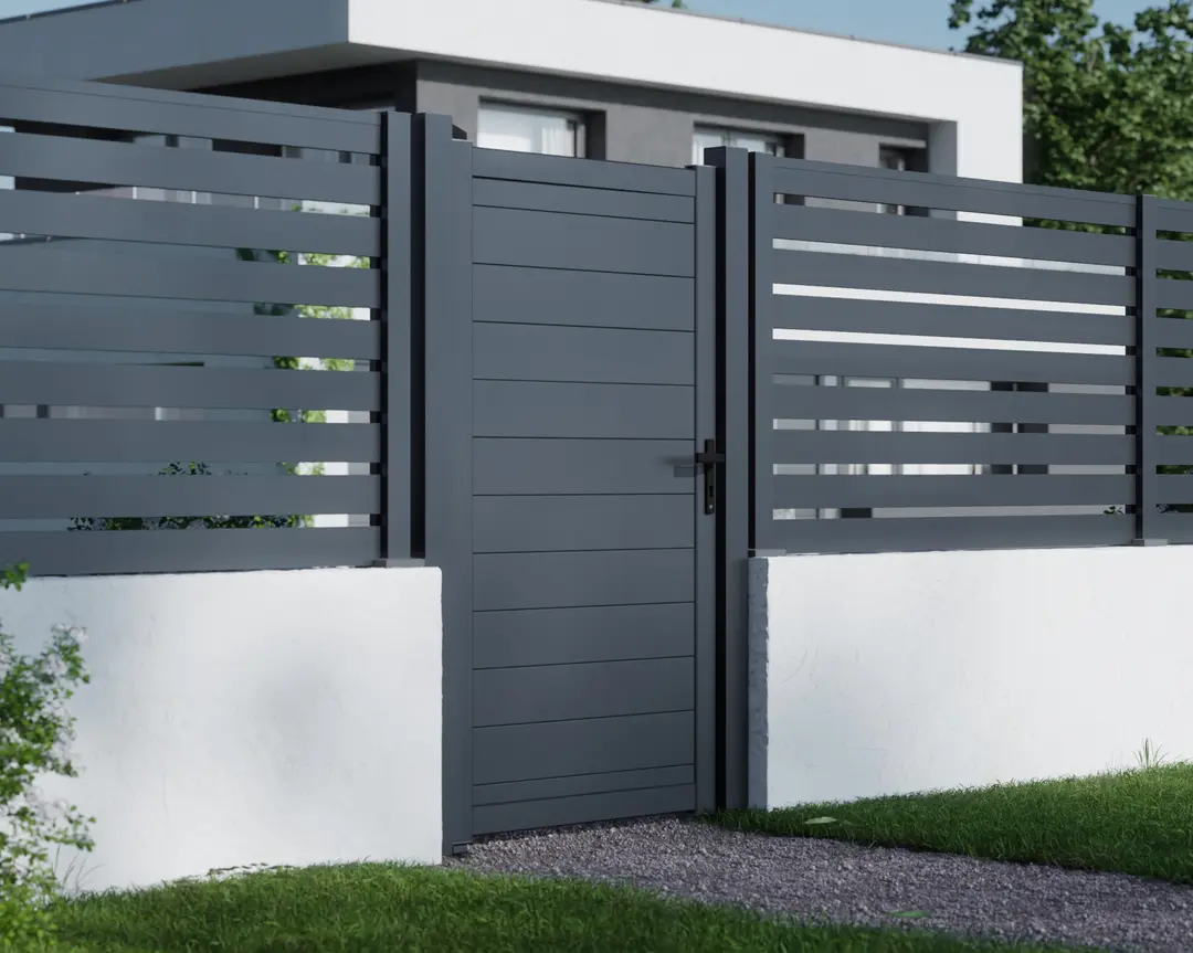 Der Torpfosten hat einen quadratischen Querschnitt von 90x90mm und eine Materialstärke von 4mm. Er muss in den Boden eingelassen werden. Um die Kontinuität des Zauns zu gewährleisten, kann ein Wandprofil angebracht werden. Der Pfosten ist in den Farben grau oder schwarz erhältlich.