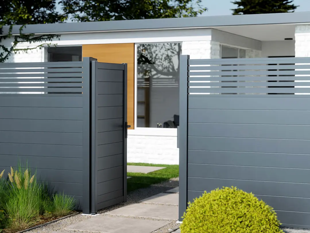 Der Rahmen der Schlupftür kann mit OPALE-Aluminium- oder PREMIUM- und MODERN-Holzverbundstoff-Lamellen ergänzt werden. Die horizontalen Pfosten des Schlupftürrahmens können zugeschnitten werden, um die Breite des Tores anzupassen. Die maximale Breite beträgt 980 mm. Wird mit Einsteckschloss geliefert. Zylinder und Griffe sind separat im Beschlagsatz erhältlich. Es werden 11 Bretter benötigt, um die Schlupftür bis zur vollen Höhe auszufüllen (ungeschnitten). Der Rahmen ist in Anthrazitgrau und Schwarz erhältlich.