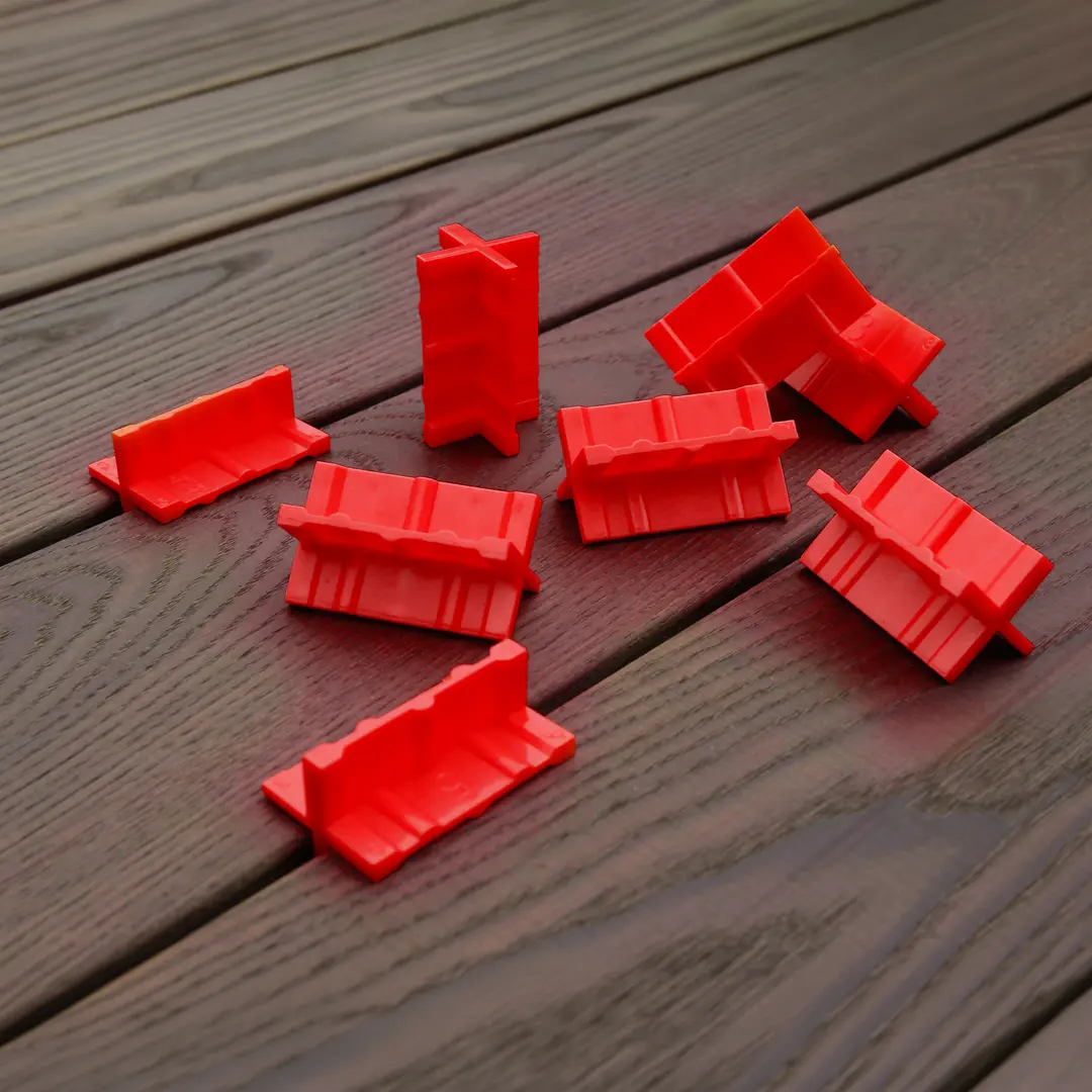 Abstandhalter für einen gleichmäßigen Fugenabstand zwischen Terrassendielen – für Hinterlüftung sowie Quell- und Schwindbewegungen gemäß DTU 51.4. Vier Flügel ermöglichen vier Fugenbreiten: 3, 4, 5 oder 6 mm.