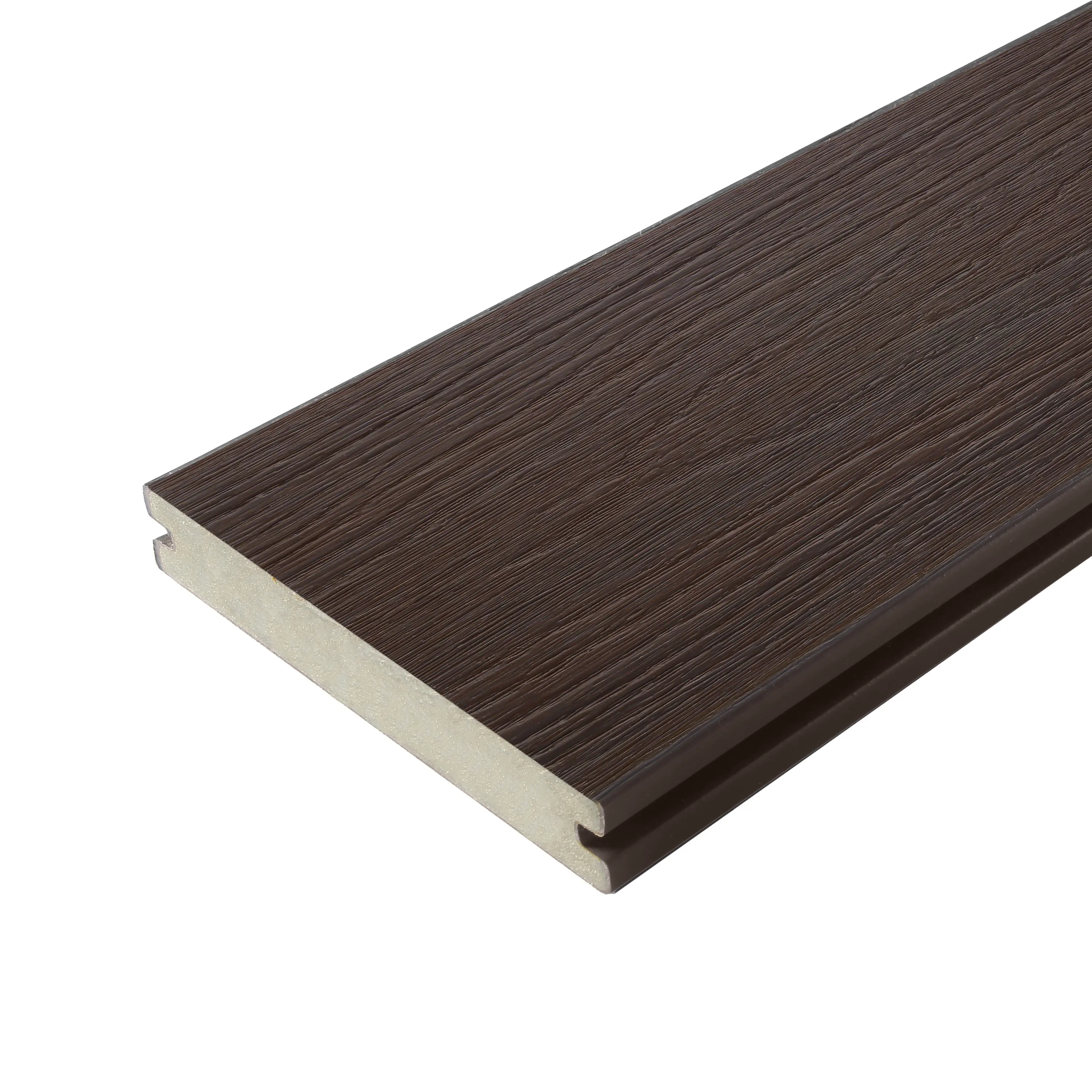 Die Fiberdeck© Premium Verbunddielen haben einen massiven Kern für eine höhere Haltbarkeit. Sie sind mit 2 nützlichen Oberflächen erhältlich. Eine ist glatt für einen zeitgenössischen Look, die andere zeigt eine Holzmaserung. Beide Seiten sind gebürstet, um eine matte Oberfläche zu erhalten. Die 360°-Co-Extrusionsschutzschicht schützt das Brett effektiv vor Stößen und Flecken. Dadurch wird der Wartungsaufwand auf ein Minimum reduziert. Die Installation erfolgt mit Hilfe von abnehmbaren Cobra© 8-18 Clips.