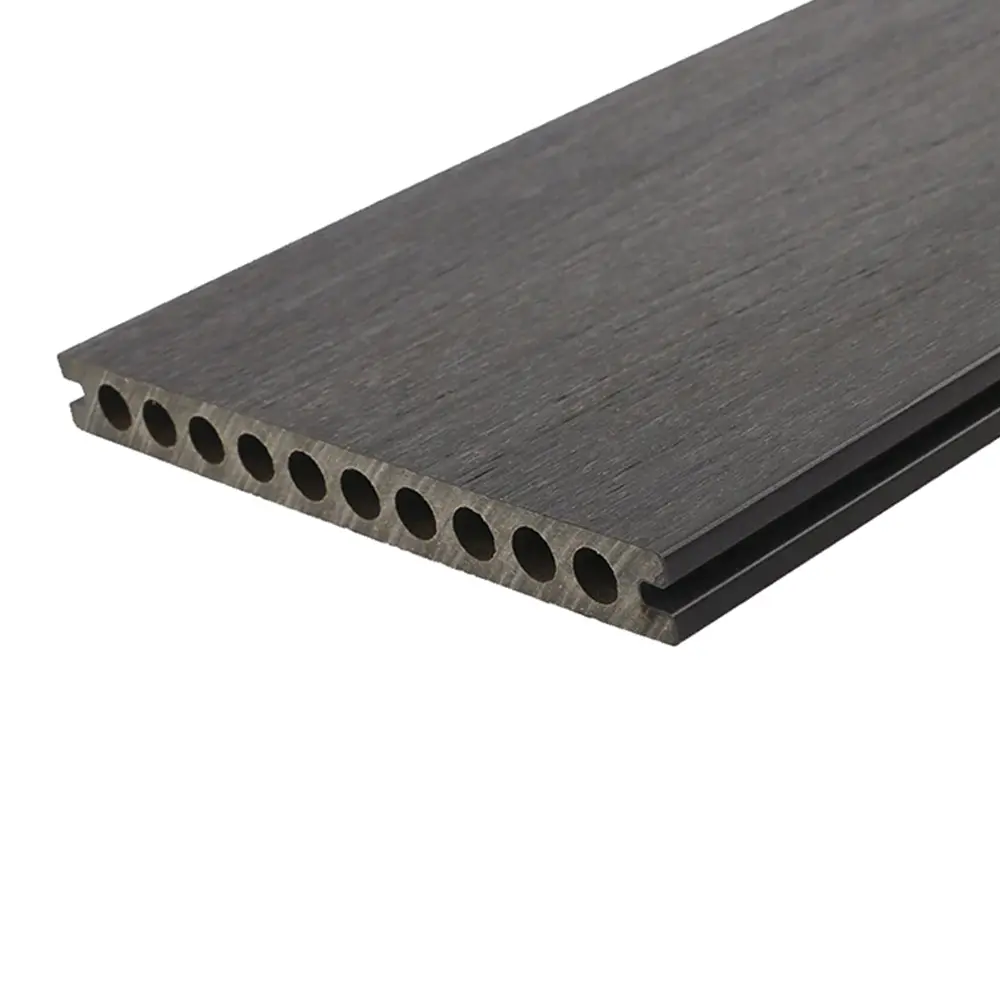 Premium WPC-Dielen haben 2 nützliche Oberflächen. Eine ist glatt für einen zeitgemäßen Look, die andere hat eine in der Masse gedruckte Holzmaserung. Beide Seiten sind gebürstet, um eine matte Oberfläche zu erhalten. Die runde Hohlform spart Material und gewährleistet gleichzeitig eine ausgezeichnete Steifigkeit. Die 360°-Co-Extrusionsschutzschicht schützt das Brett effektiv vor Stößen und Flecken. Die Installation erfolgt mit Hilfe von abnehmbaren Cobra© 8-18 Clips.