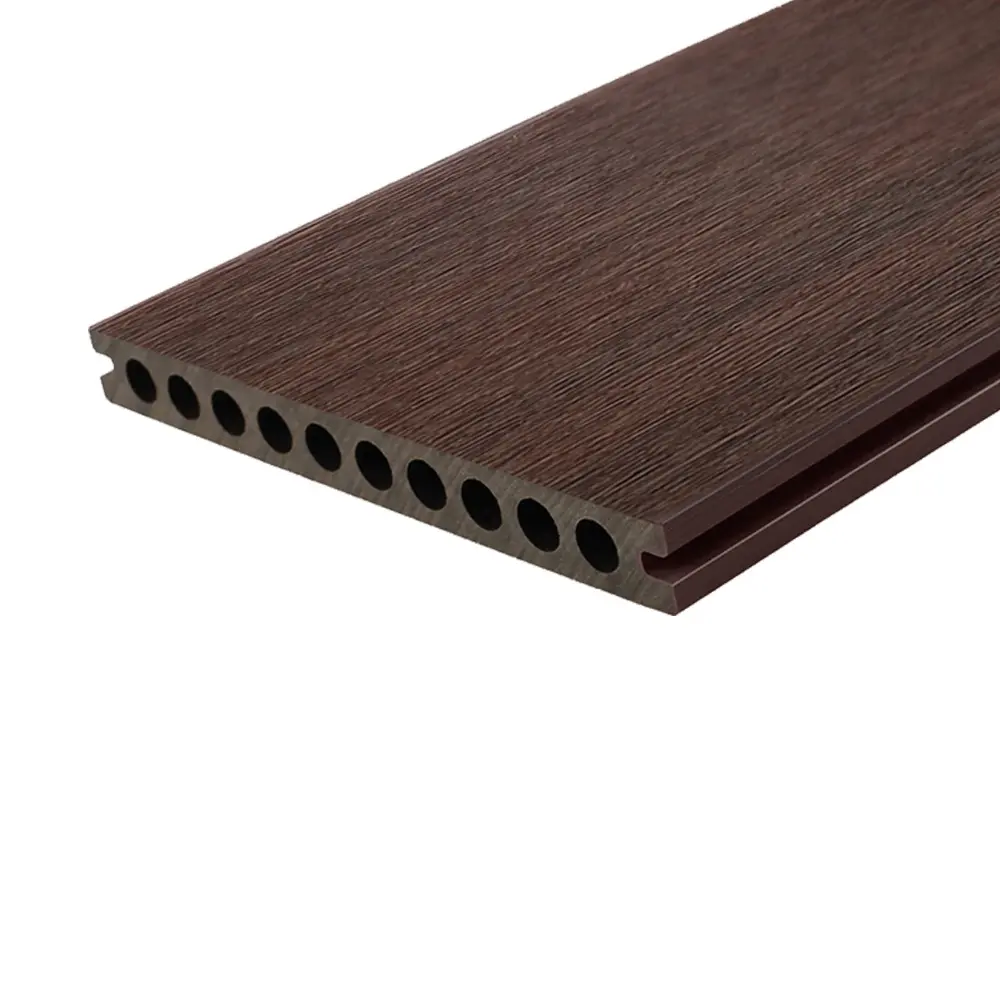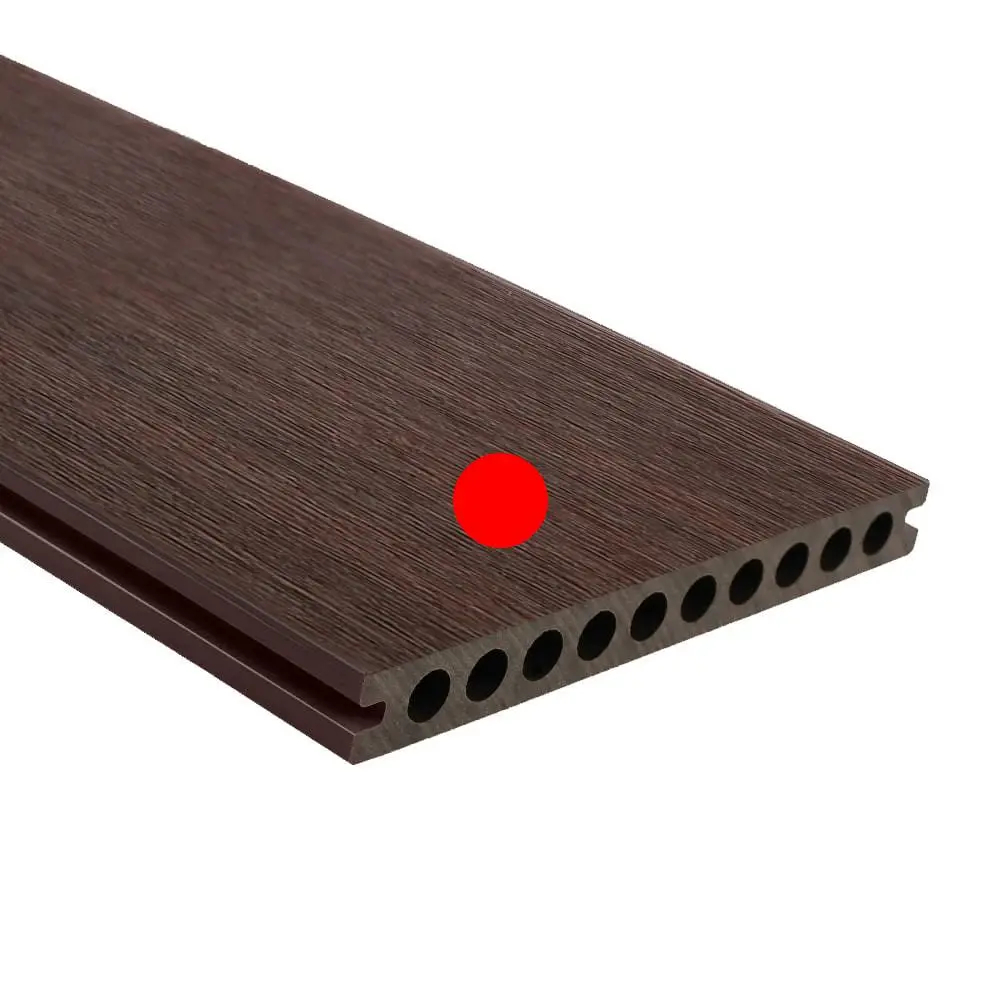 Premium WPC-Dielen haben 2 nützliche Oberflächen. Eine ist glatt für einen zeitgemäßen Look, die andere hat eine in der Masse gedruckte Holzmaserung. Beide Seiten sind gebürstet, um eine matte Oberfläche zu erhalten. Die runde Hohlform spart Material und gewährleistet gleichzeitig eine ausgezeichnete Steifigkeit. Die 360°-Co-Extrusionsschutzschicht schützt das Brett effektiv vor Stößen und Flecken. Die Installation erfolgt mit Hilfe von abnehmbaren Cobra© 8-18 Clips.