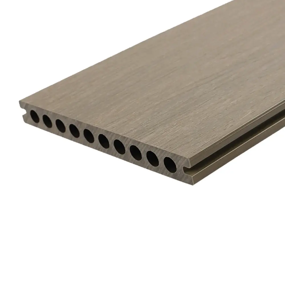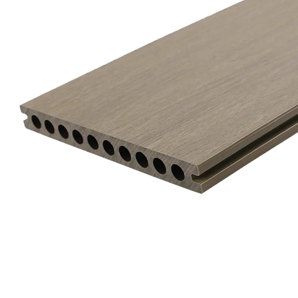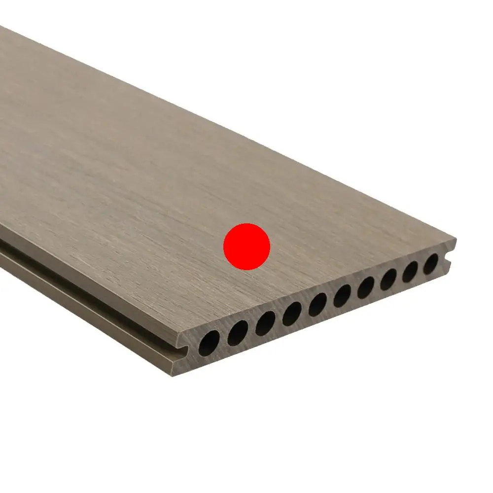 Premium WPC-Dielen haben 2 nützliche Oberflächen. Eine ist glatt für einen zeitgemäßen Look, die andere hat eine in der Masse gedruckte Holzmaserung. Beide Seiten sind gebürstet, um eine matte Oberfläche zu erhalten. Die runde Hohlform spart Material und gewährleistet gleichzeitig eine ausgezeichnete Steifigkeit. Die 360°-Co-Extrusionsschutzschicht schützt das Brett effektiv vor Stößen und Flecken. Die Installation erfolgt mit Hilfe von abnehmbaren Cobra© 8-18 Clips.