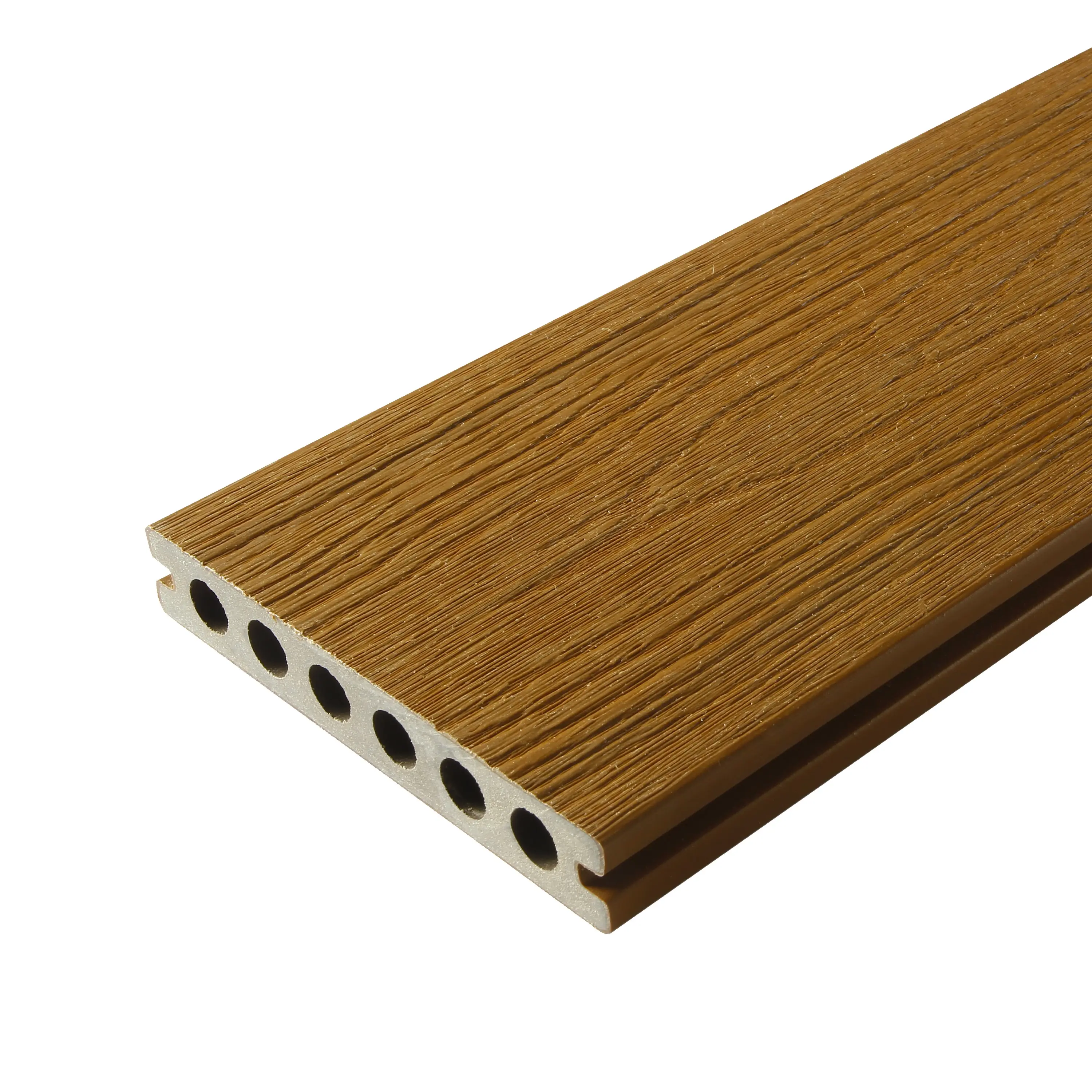Brooklyn composite decking comes with 2 useful faces. One is smooth for a contemporary look, the other one has a wood grain printed in the mass. Both sides are brushed to give a matt surface. The round hollow shape saves material while ensuring excellent rigidity. The 360° co-extruded protective layer effectively protects the board from knocks and stains. Installation is carried out using Cobra© 8-18 removable clips.