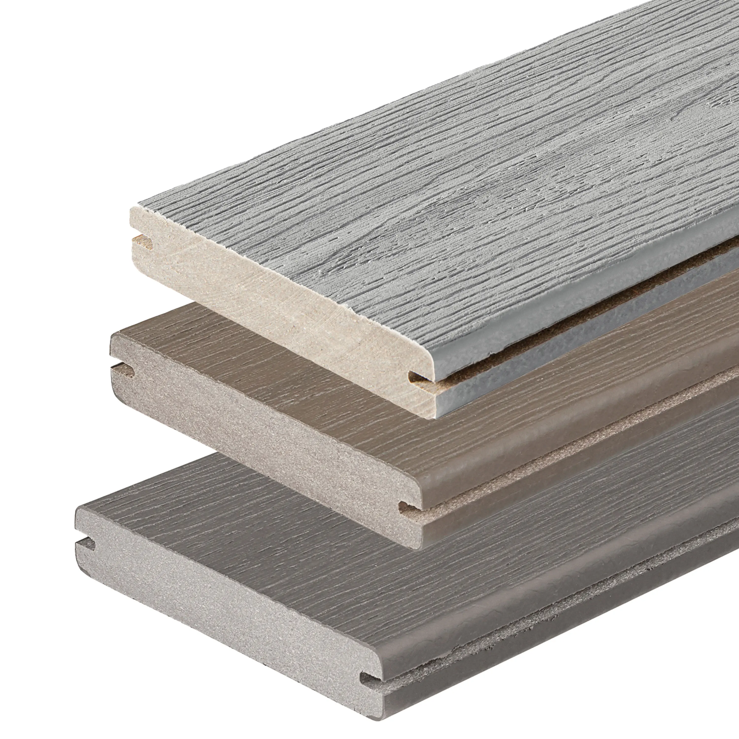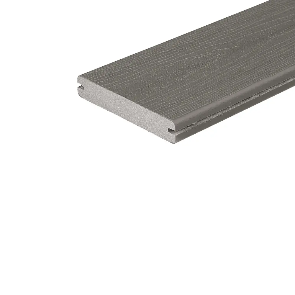 Fiberon© co-extruded composite decking using Permatech© technology. The protective layer covers the entire board. It protects the board against stains and discolouration. The 2 faces are identical. The board is solid and solid. It works like wood. The wood decor is printed in the mass, giving the board its character. The colours are multichromatic. Maintenance is carried out with a broom and clear water. Cleaning is kept to a minimum. A few millimetres of extra length at the end of the board to be recut on delivery. Installation with Cobra Hybrid 8-18 or Cobra 24 clips.
