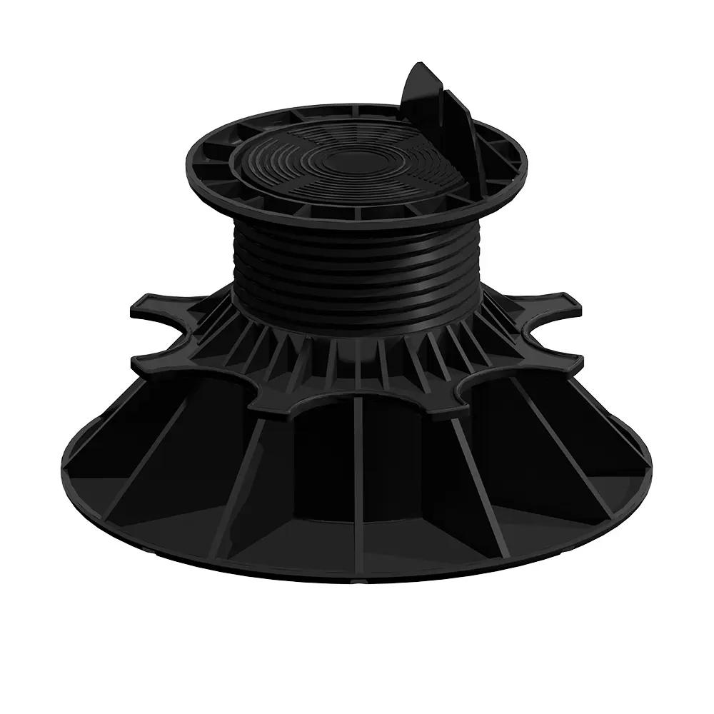 Adjustable pedestals with L-shaped head designed to support and level wood or aluminum joists. 5 sizes for elevations from 25 mm to 230 mm. Up to 530 mm with stackable 60 mm risers (max 5). Rotary ring for precise level adjustment of the structure. Each pedestal supports up to 800kg load. Weather and UV resistant. Stable 20cm base prevents sinking into the ground, ideal for use on waterproof flat roofs. Compliant with DTU 51-4 and 43-1.