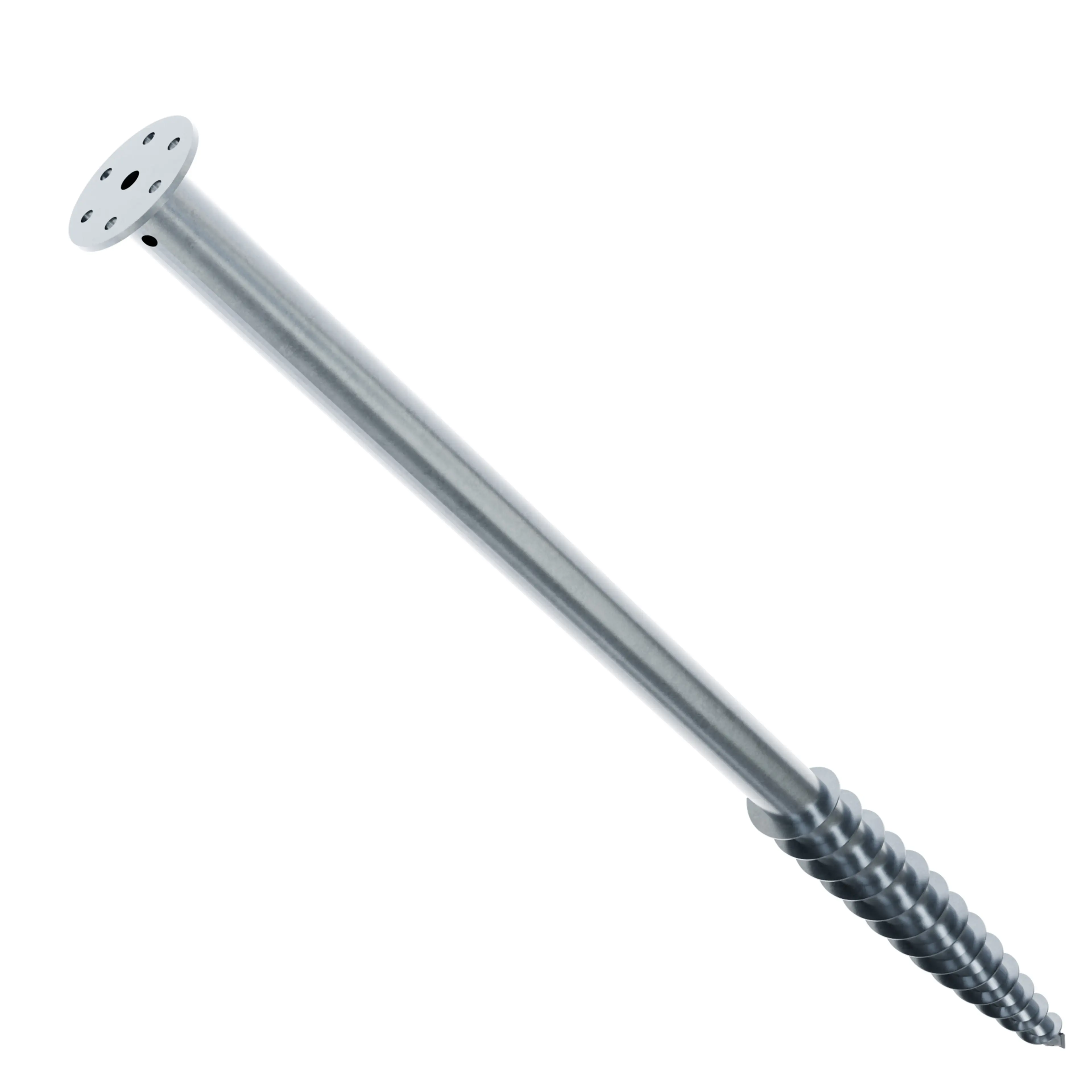 Reinforced galvanized steel foundation screw designed to anchor in the ground a wood or aluminum structure composed of crossed beams and joists. Must be driven into loose soil and backfill to a minimum depth of 80 cm. Effectively and economically replaces concrete. Each screw can support a load of 1000 kg. Available in lengths of 800mm, 1200mm and 1500mm. Diameter 60mm. Supplied without support fixing head.