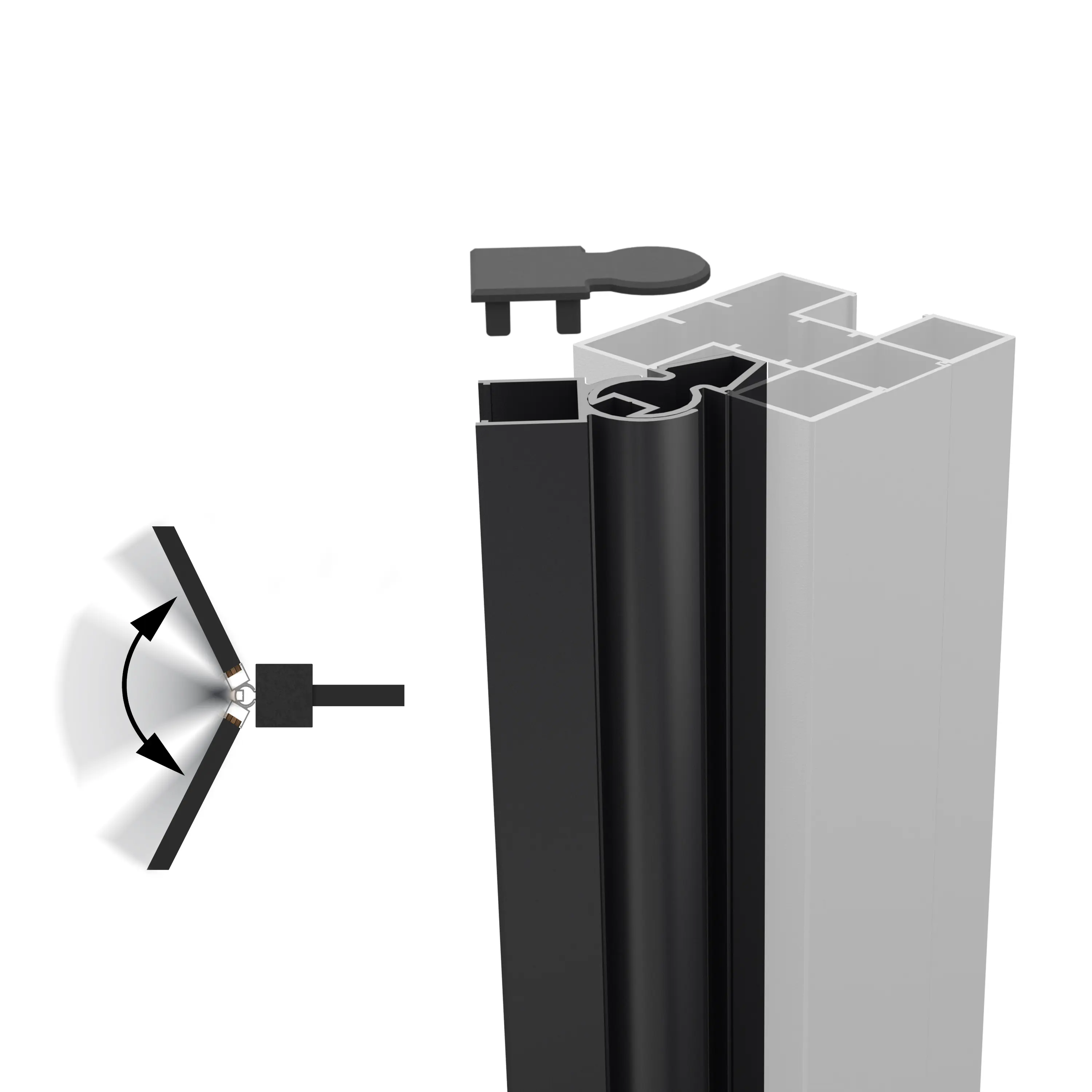 Le kit d'angle pour poteau permet à la clôture BOSTON de s'adapter à n'importe quel angle de tracé. Ce système breveté est composé d’un axe qui se clipse dans la rainure du poteau 75x75mm, et d’un pivot qui tourne autour de l’axe. Ces deux profilés ont une hauteur de 2000mm. L’ensemble est fourni avec la visserie associée ainsi qu'un chapeau. Disponible en gris anthraciteou noir.