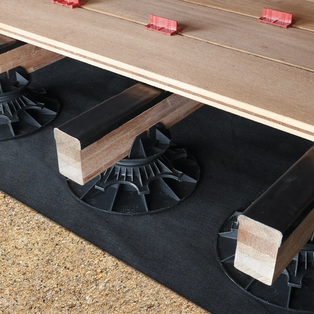 Plots réglables avec tête en L conçus pour supporter et mettre à niveau un lambourdage en bois ou en aluminium. 5 tailles pour des élévations de 25 mm à 230 mm. Jusque 530 mm avec les réhausses de 60 mm empilables (max 5). La bague rotative pour un réglage précis du niveau de la structure. Chaque plot supporte jusqu'à 800kg de charge. Résistant aux intempéries et aux UV. Base stable de 20cm qui évite l'enfoncement dans le sol, idéal pour un usage sur toit terrasse étanche. Conformes au DTU 51-4 et 43-1.