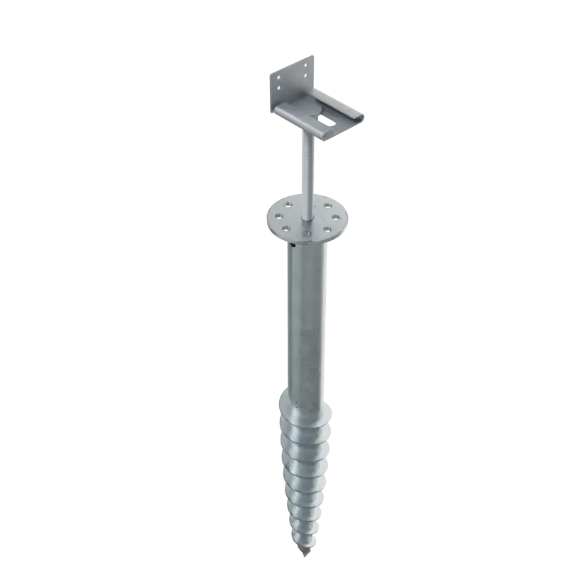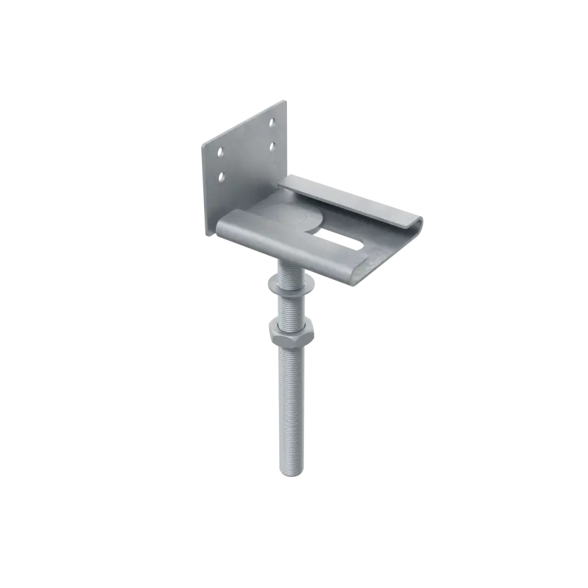 Tête en acier galvanisé pour fixer une lambourde sur la vis de fondation SPIRAL. Support en L pré-percé monté sur une tige filetée M16 permettant un réglage en hauteur ainsi qu'un ajustement latéral ou axial.