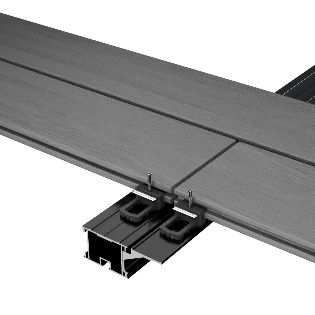 Permet un aboutage optimal des lames de terrasse sans double lambourdage. L'ergot d'accroche facile la pose et le vissage de la pièce sur la lambourde. Rail de 2 mètres laqué noir mat, recoupable selon le besoin de pose et la largeur de la lame. Compatible avec la pose des lames par clips ou par vis.