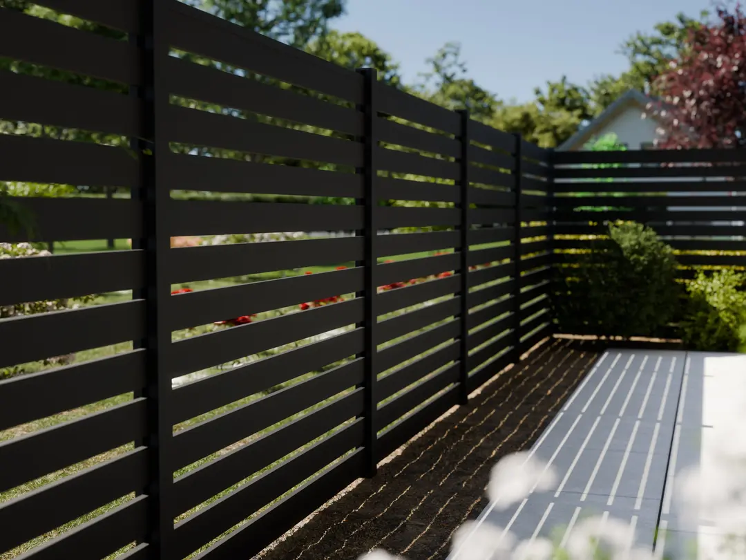 De aluminium lamellen bieden een subtiele balans tussen privacy en openheid. De sterke visuele aanwezigheid geeft het een beschermende en robuuste uitstraling. Er kunnen klimplanten worden geplant om de privacy te vergroten en een natuurlijker tintje aan de omheining te geven. De afstand tussen de open lamellen kan worden aangepast met afstandhouders, verkrijgbaar in verschillende hoogtes en stapelbaar. De lamellen beschikken over een coating volgens de Qualicoat en Qualimarine processen.