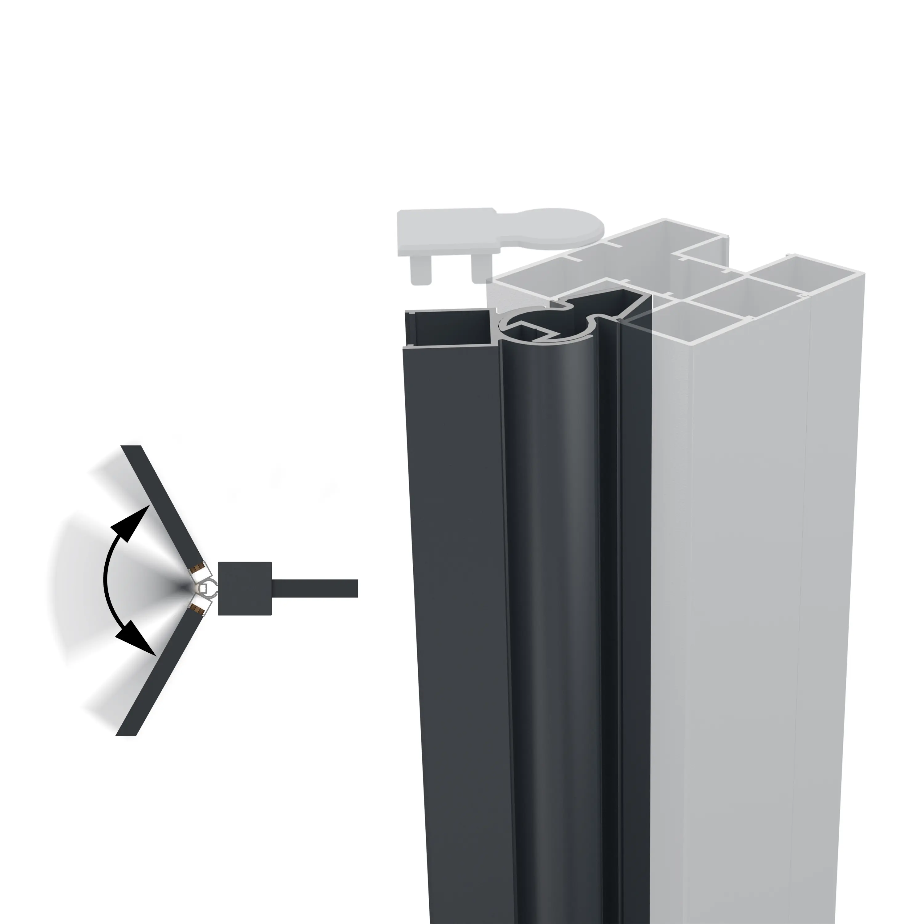 Het variabele hoekprofiel voor BOSTON maakt het mogelijk om iedere gewenste hoek toe in de tuinafscheiding te realiseren. Dit gepatenteerde systeem bestaat uit een as die in de groef van de H paal (75x75mm) wordt geklikt, en een draaipunt dat rond de as draait. Beide profielen hebben een hoogte van 200 cm. Het geheel wordt geleverd met bijbehorend bevestigingsmateriaal en een kap. Verkrijgbaar in antraciet grijs of zwart.