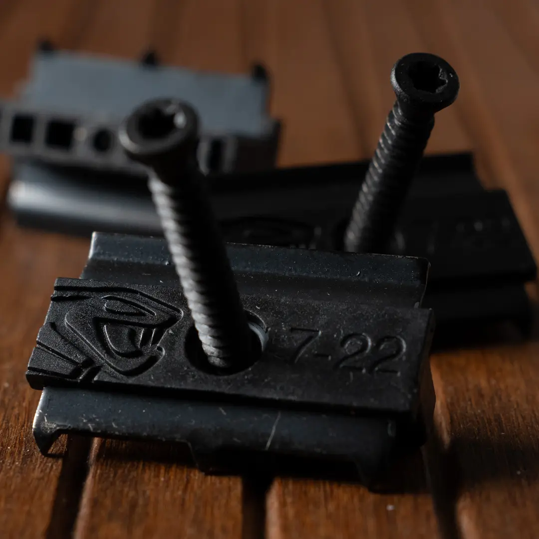 Asymmetrische clip bestaande uit een roestvrijstalen vin en een honingraatvormig lichaam van hoogwaardig . Voorzien van een hoogwaardige zelfborende roestvrijstalen schroef. Geschikt voor bamboe en thermisch gemodificeerd hout. Universeel, compatibel met omkeerbare planken van 18 tot 24 mm dik en maximaal 150 mm breed. Bevestiging op houten of aluminium balken. Respecteert het krimp en zwel gedrag van de terrasplanken. Eenvoudige en snelle montage. Lokale demontage en hergebruik mogelijk. Per 90 verpakt, incl. schroeven.