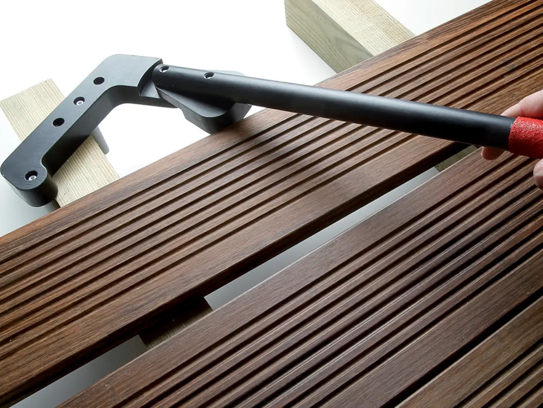 Hefboomarm voor het rechttrekken en vasthouden van terrasplanken. Eenvoudig te gebruiken en omkeerbaar voor rechts- of linkshandigen. Ergonomisch en licht gereedschap. Geleverd met 2 paar noppen van verschillende groottes, 25 mm en 45 mm, om aan te passen aan de afmetingen van de balken.