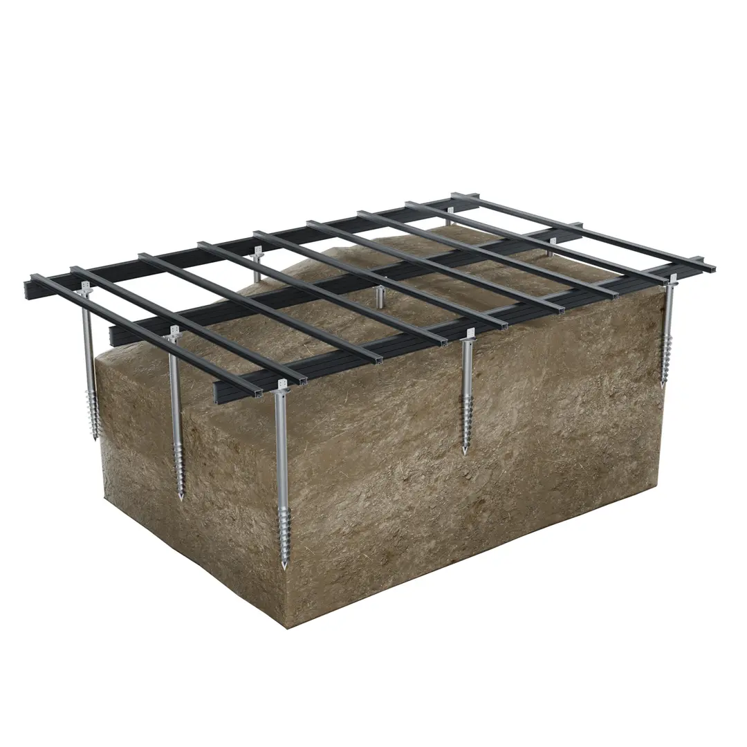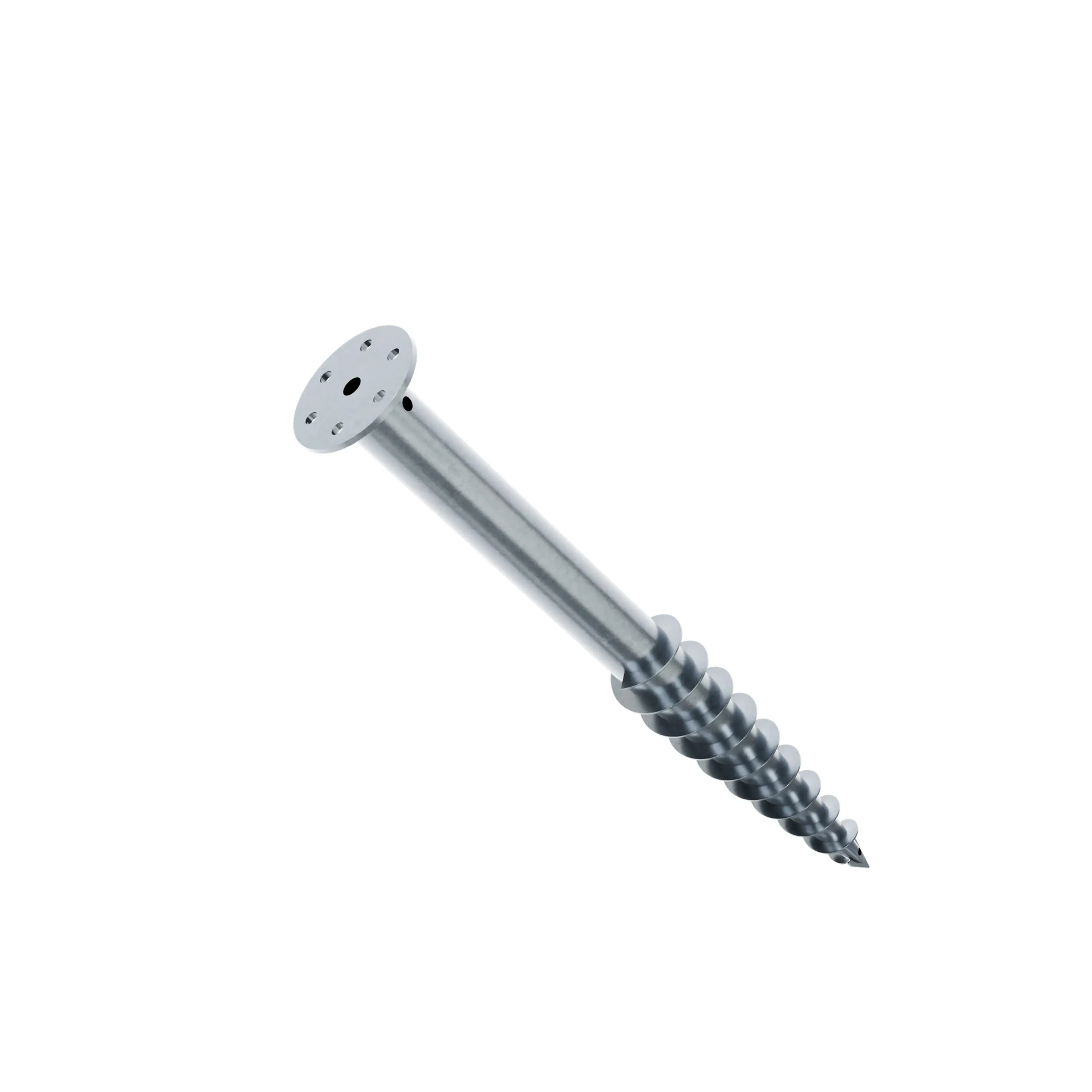 Versterkte gegalvaniseerde stalen funderingsschroef ontworpen om in de grond een houten of aluminium structuur bestaande uit gekruiste balken en dwarsbalken te verankeren. Moet in losse grond en opvulling op een minimale diepte van 75 cm worden gedreven. Vervangt effectief en economisch beton. Elke schroef kan een belasting van 850 kg dragen in stevige grond. Verkrijgbaar in lengtes van 800 mm, 1200 mm en 1500 mm. Diameter 60 mm. Geleverd zonder steunbevestigingskop.