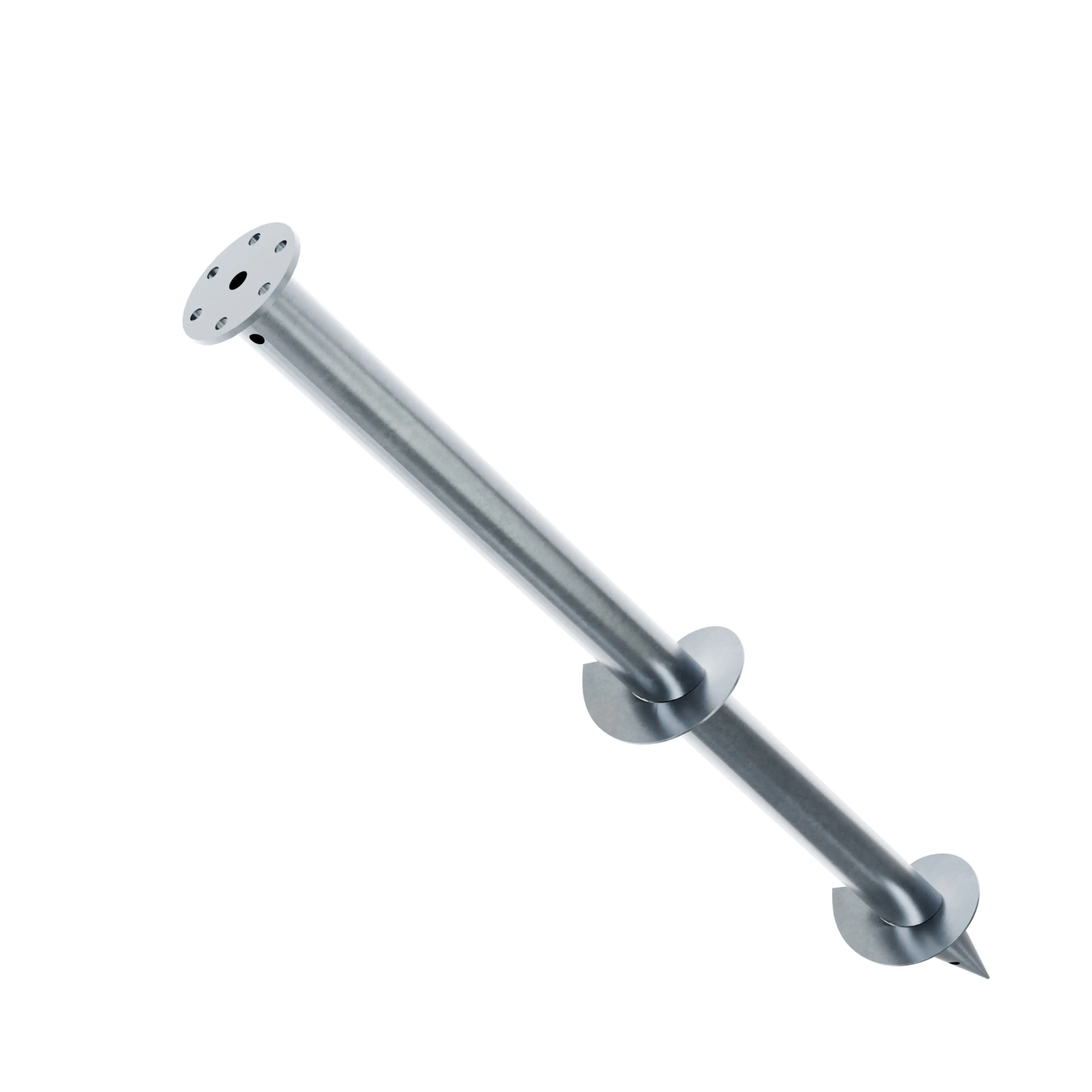 Verzinkte stalen funderingsschroef, die wordt gebruikt om een houten- of aluminiumstructuur van balken en gekruiste dragers te verankeren in zand of zeer losse grond. Het moet minimaal 70 cm diep worden ingedraaid. Elke schroef kan een belasting van 475 kg dragen. Diameter van 60 mm. Wordt geleverd zonder bevestigingskop.